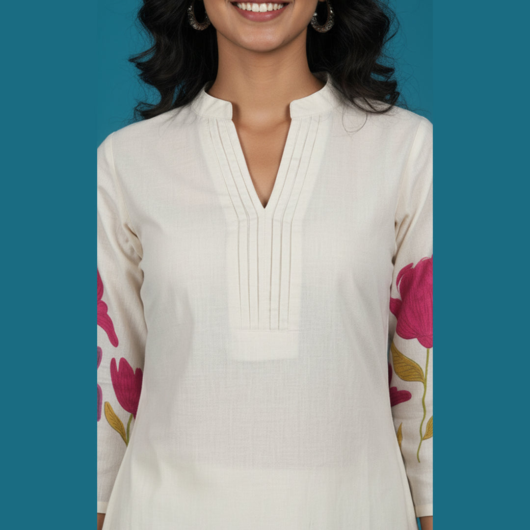 Step out in style and comfort with this exquisitely crafted Hand-Painted Floral Cotton Kurta and Pant Set. This two-piece ensemble features a classic off-white base made from soft, breathable cotton mulmul, ensuring all-day comfort.